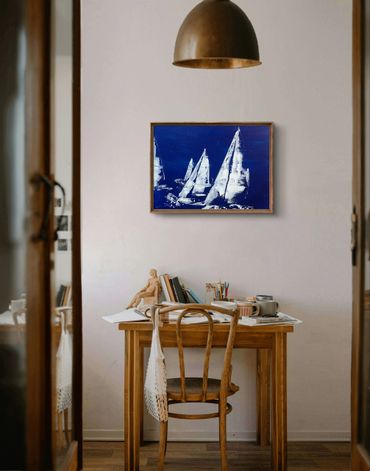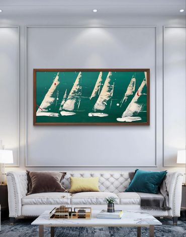 Discover unique and captivating art pieces created by me, Lindsey Witthaus. I offer multiple paintings in my sailboat series with bursts of color contrasting the sleek grace of the sails. I also offer custom work, whether that be using one of your personal sails or requesting particular coloring or background.